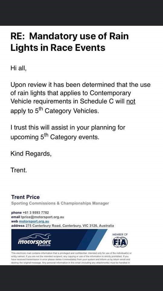 Unknown whether it has been driven by the historic movement or on their own, they have moved to clarify that it is not mandatory for rain lights to be fitted to historic vehicles. Below is an email sent and then posted to social media confirming the change, although no formal statement is on the Motorsport Australia website as yet.